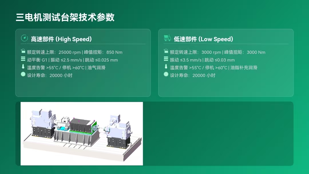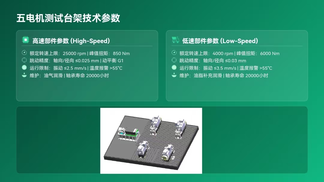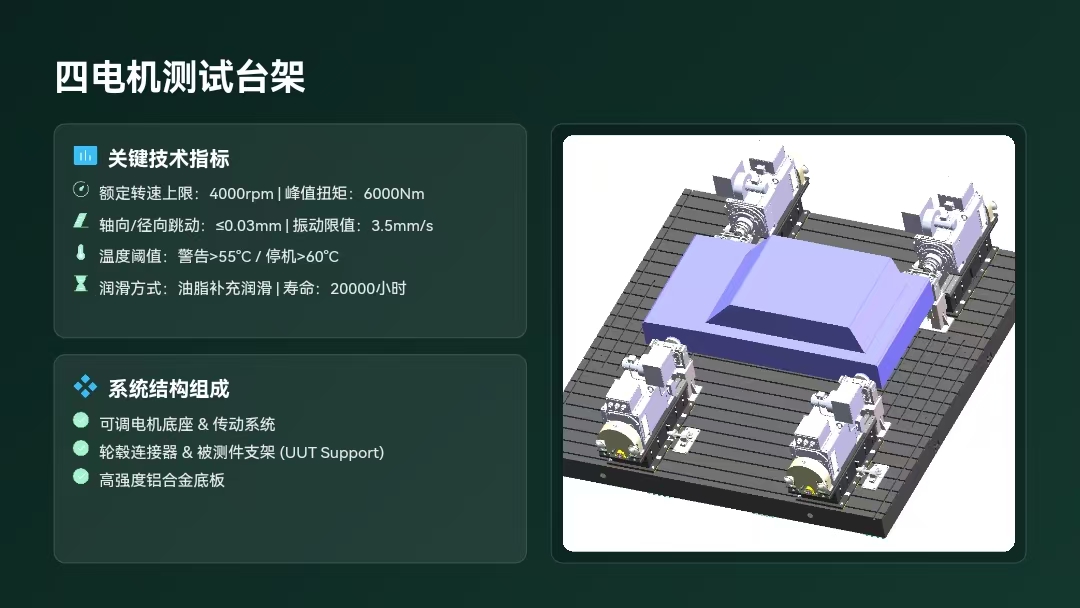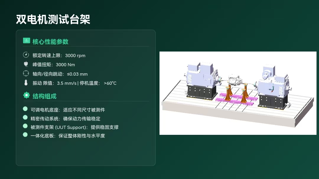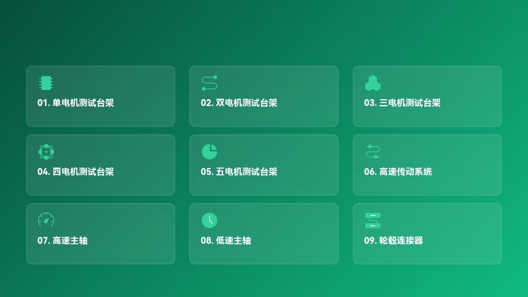 在近十年的摸索实践中不断创新,形成了满足各类台架的测试方案,其中包括单电机、双电机、三电机、四电机、五电机、高速传东系统、高低速主轴等测试